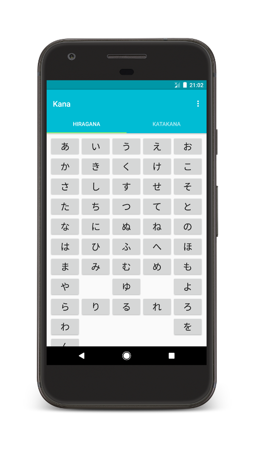 Kana is an Android app that provides a reference to the basic Japanese characters. It was built as a project for me to learn the fundamentals of Android development.